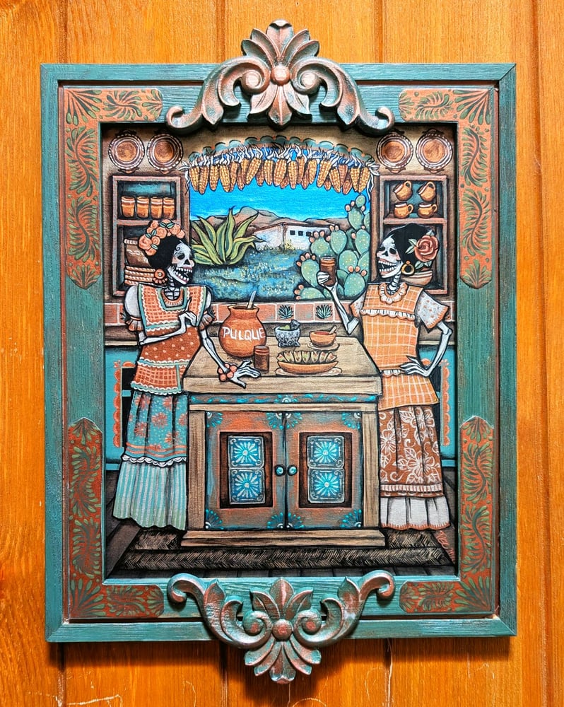 Painting kitchen scenes featuring my Muertitos has been something I've been doing for two decades now. I find comfort in the tiny details of my little afterworld kitchen scenes. I remember details from my grandmother's kitchen and pull them into my paintings because the kitchen was the heart of her home. It seems that when life got too crazy, everything would just stop when I was in my grandmother's kitchen. feeling like a grown-up because she let me drink coffee with cream and tons of sugar. Special cold nights it would be atole and hard biscuits. Holidays were filled with family and laughter in my grandmother's kitchen. Even the hard times seemed to end up in her kitchen. The kitchen holds memories of love. Through it all.