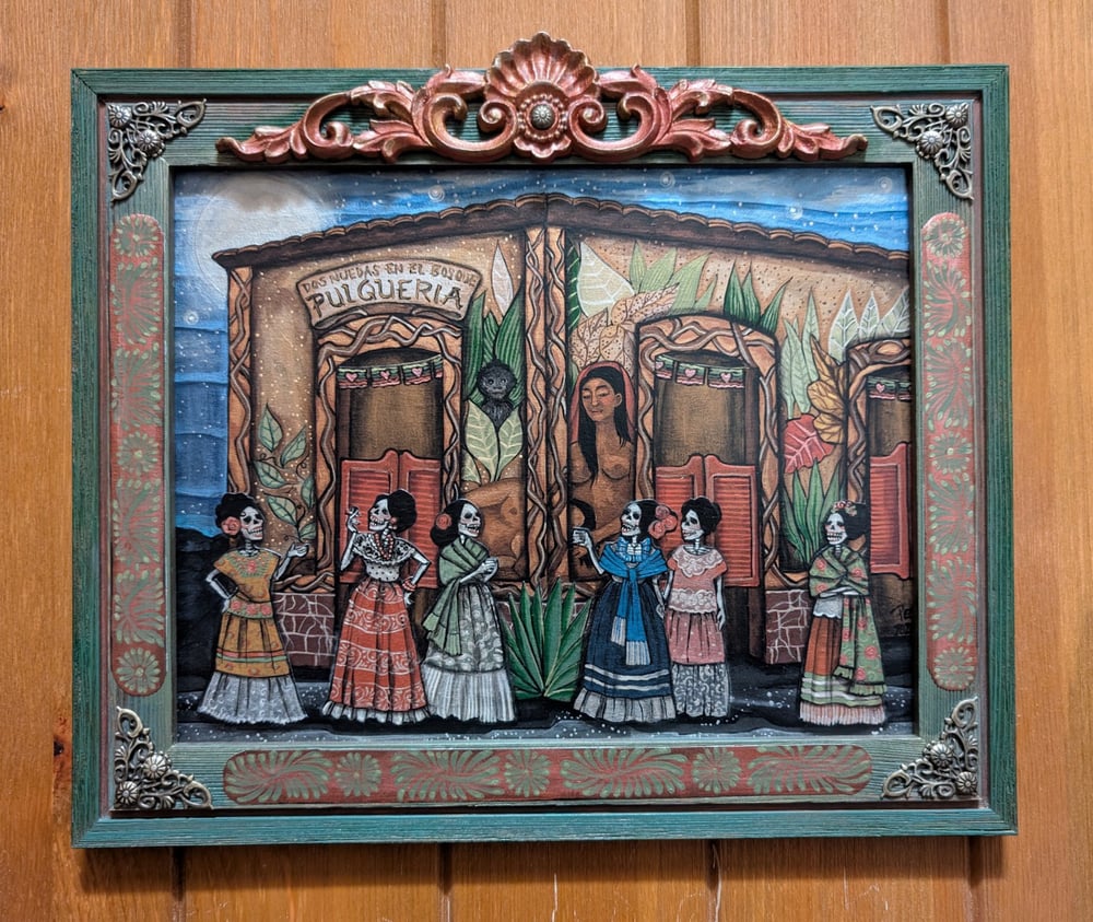 Noche de Mujeres is based on the Pulqueria that was once owned by Frida Kahlo, named La Rosita. I used the shape of that building then decided to continue with a Frida themed Pulqueria using her original artwork, Dos Nudas en el Bosque as the front mural. I imagined that if Frida were alive today and owned that Pulqueria, that it would be filled with women sharing stories, making friends, maybe finding a little romance, all the while knowing that they were in a space where it was safe to drink and let loose without fear. And that is what I created, but of course in Day of the Dead fashion because you all know I love painting my Muertitos... my little dead people,